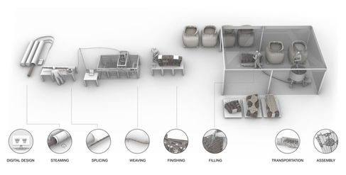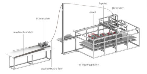 Building with bio-based materials like willow poses challenges due to their inherent variability. Therefore, the project emphasizes the co-evolution of the material system and the fabrication process. To achieve this, a comprehensive fabrication system is developed, starting with a two-axis machine capable of extruding and depositing continuous macro-fibres made from spliced willow branches using additive techniques. Controlling the machine's extrusion, movement, and deposition path proves challenging due to factors such as the flexibility and varying thickness of willow branches, as well as the requirement for tensioning in the final components.